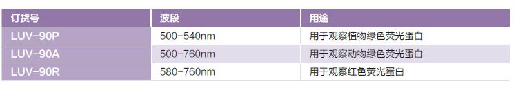LUV-90P 用于觀察植物綠色熒光蛋白LUV-90A 用于觀察動物綠色熒光蛋白LUV-90R 用于觀察紅色熒光蛋白