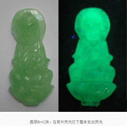 翡翠B貨、B+C貨都經歷了強酸浸蝕、有機膠充填或者充蠟的處理過程。在紫外熒光燈照射下,有機膠和蠟都會發出明顯的紫外熒光,也就是整個翡翠出現均勻的紫外熒光,視為處理翡翠。天然翡翠因不含有機膠和蠟,在紫外熒光燈下不會發出紫外熒光。